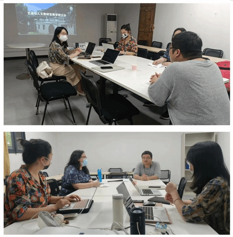 会议主要围绕三个话题进行:全国高等艺术院校首届通识教育教学研讨会会后分享;学习、制作线上线下混合教学中的“教学视频”;陈榭非老师教学展示,其他老师参与评课。