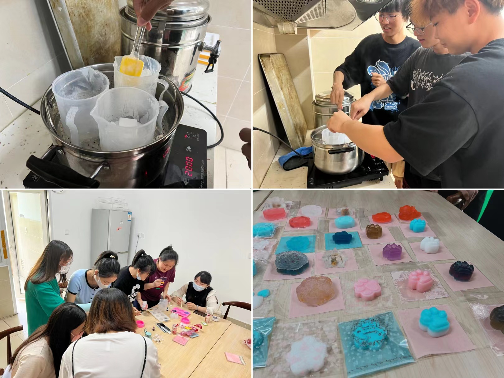 陈春彦老师、钟婷婷老师和陈思含老师将准备好的香皂原材料分发给各组学生,分别带领学生示范制作香皂的过程:加温、放皂基、调试颜料、搅拌、倒入模具、冷却,……不一会儿,一个个带着香味、色泽亮丽的香皂就成形了。学生们纷纷动手尝试着自己做香皂,最终制作出了一块块形状各异不同颜色的手工皂。