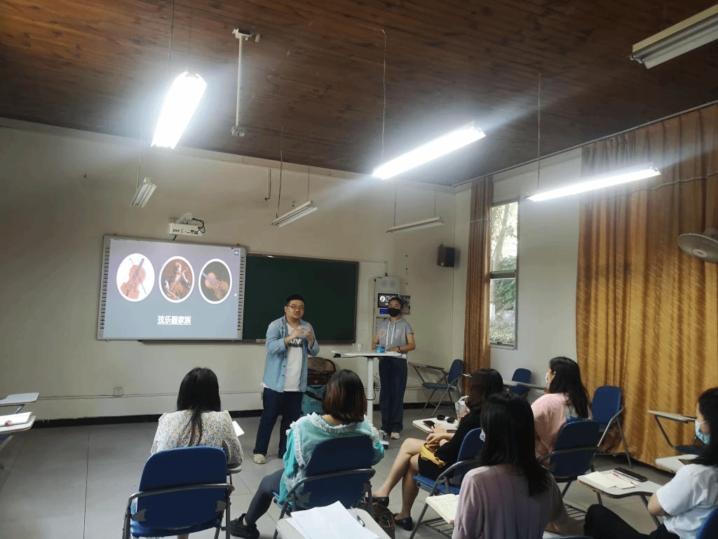 陈榭非老师的授课重点落在《古典音乐入门》中的弦乐板块。陈榭非老师准备了拿手好戏,带着全场现场“拨弦”。听完陈老师的课,各位老师也切实的提醒其教学环节中可以调整与改进的要点,还有注意PPT上的细节设计等等。