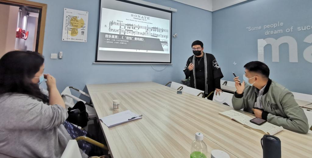 会议伊始,赵丹老师汇报了《艺术史》课程的建设进度,以及根据前期课程建设讨论而做出的教学调整,并对课程资源库和线上线下混合式教学模式的建设思路与团队成员交流意见。赵老师提出教学中的过程考核数据有着“数量大”和“易可视化”的特点,可以充分利用网络平台,并分享了课程微信公众号——“呢喃艺语”的建设情况,如板块划分、内容设置、推广思路等,可以此来开启线上线下混合教学的第一步。陈曦老师对赵老师的意见表示高度认同,并补充道,每个学期的课程内容会随着时下流行的新话题而变化,通过线上平台无论是对教学还是对学生的成果记录都有着极大的帮助,同时对后期教学素材的横向、纵向拓展也是十分有益的。