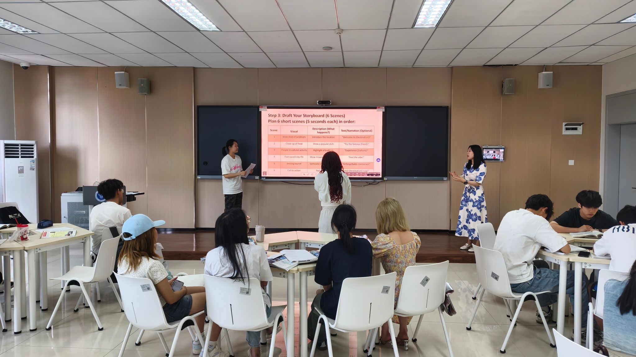 理论讲解后,课堂进入实践环节“Draft Your Storyboard”。同学们以小组为单位,按照顺序规划六个短场景,创作旅行视频故事板。在两位老师的共同指导下,各小组充分发挥创意,将课堂所学转化为实践成果。展示环节中,学生们自信地走上讲台分享创作理念,现场气氛热烈。