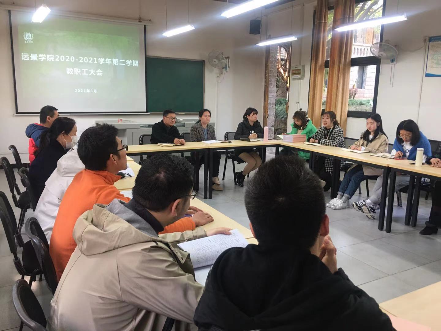 3月4日下午在菩提书院教室五,学院组织召开新学期教职工大会。安排部署2021年重点工作任务,为迎接2021年新学期开学打足基础,为“十四五”开局之年做足准备。参会的有远景学院执行院长皮若兰、学工副院长李军、各教研室全体教职工以及辅导员,会议由学工副院长李军主持。