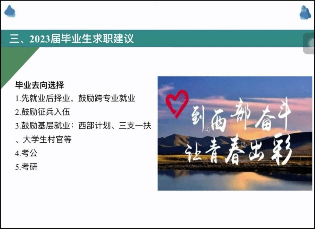 紧接着,周老师讲述对于毕业去向选择,可以先就业后择业。非常鼓励跨专业就业,因为出身社会之后,很少有人的工作会是自己的专业;鼓励征兵入伍;鼓励基层就业,比如说西部计划、三支一扶、大学生村官等等,都可以实现自己的价值。