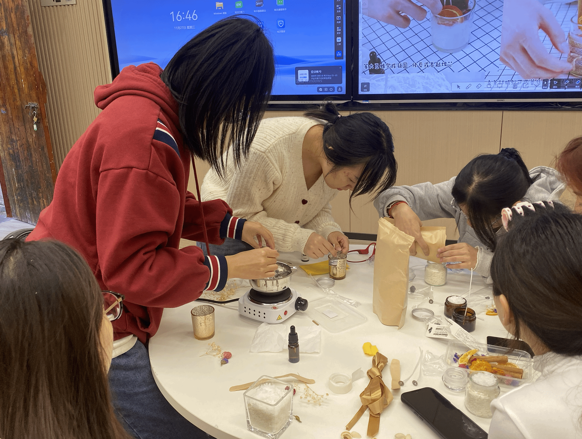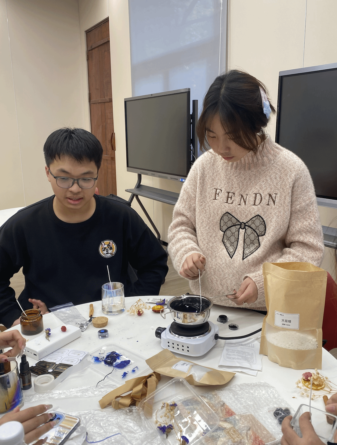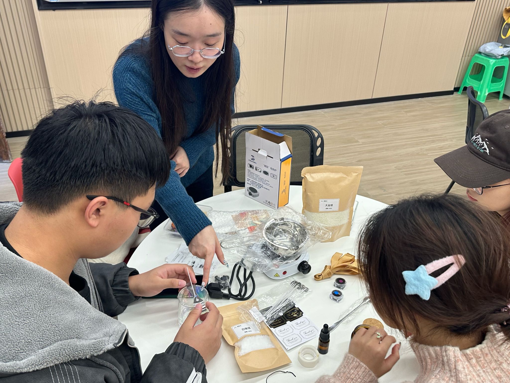 理论知识讲解完毕,实践环节随即上演。在戴华与朱姝霖老师的悉心指导下,同学们化身小小香氛师,挑选心仪的精油与装饰,将理论知识融入指尖艺术,从蜡油缓缓融化到蜡烛渐成雏形,每一步都凝聚着专注与创意。尽管初次尝试难免手忙脚乱,但正是这些不经意的小插曲,为活动增添了几分欢笑与温馨,让手作的乐趣倍增。