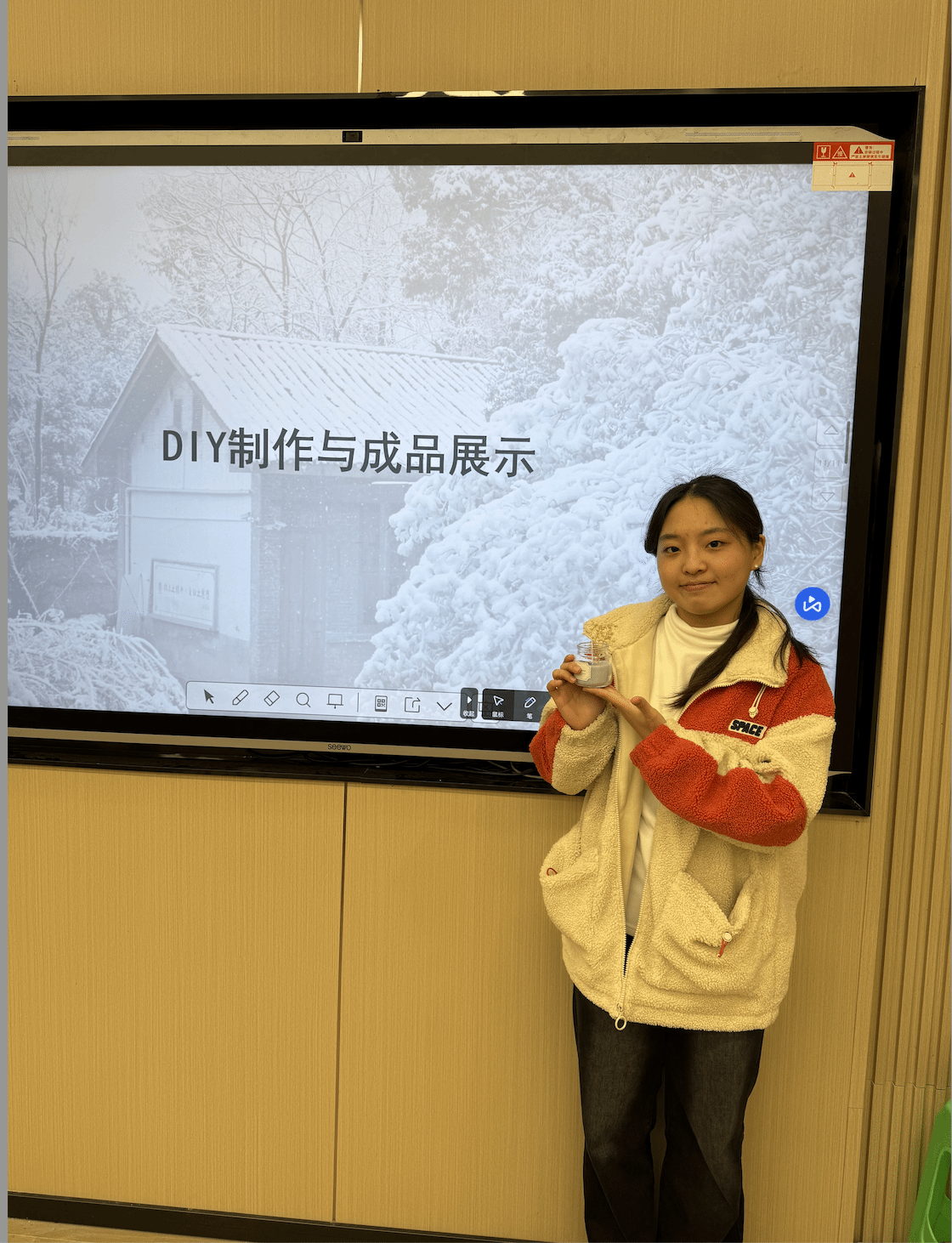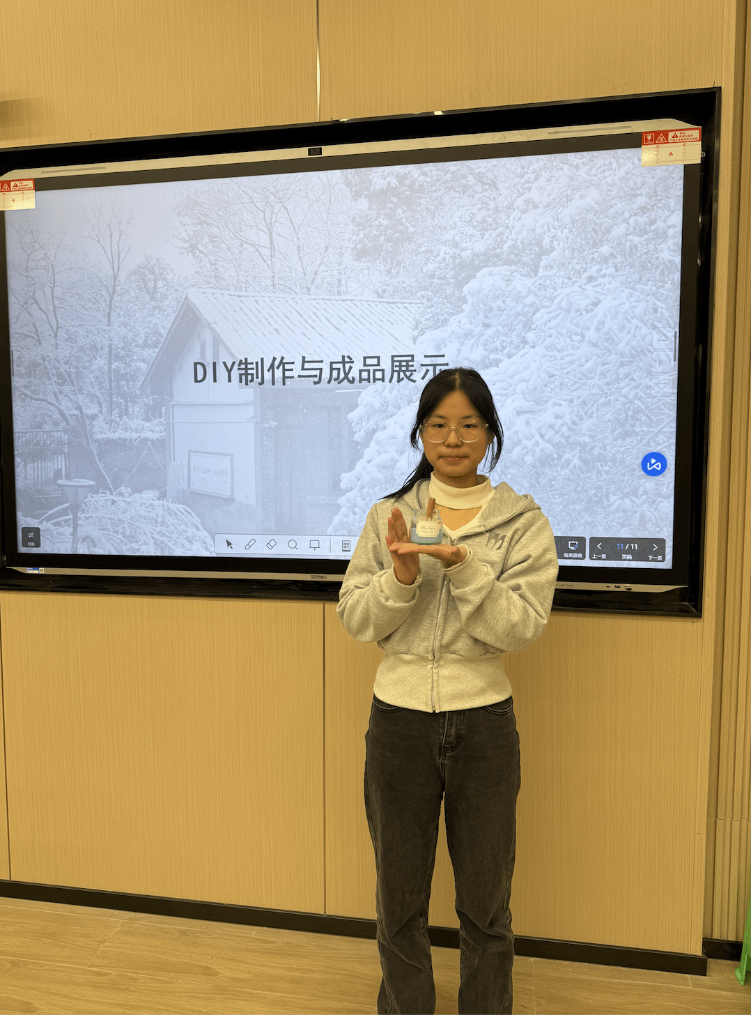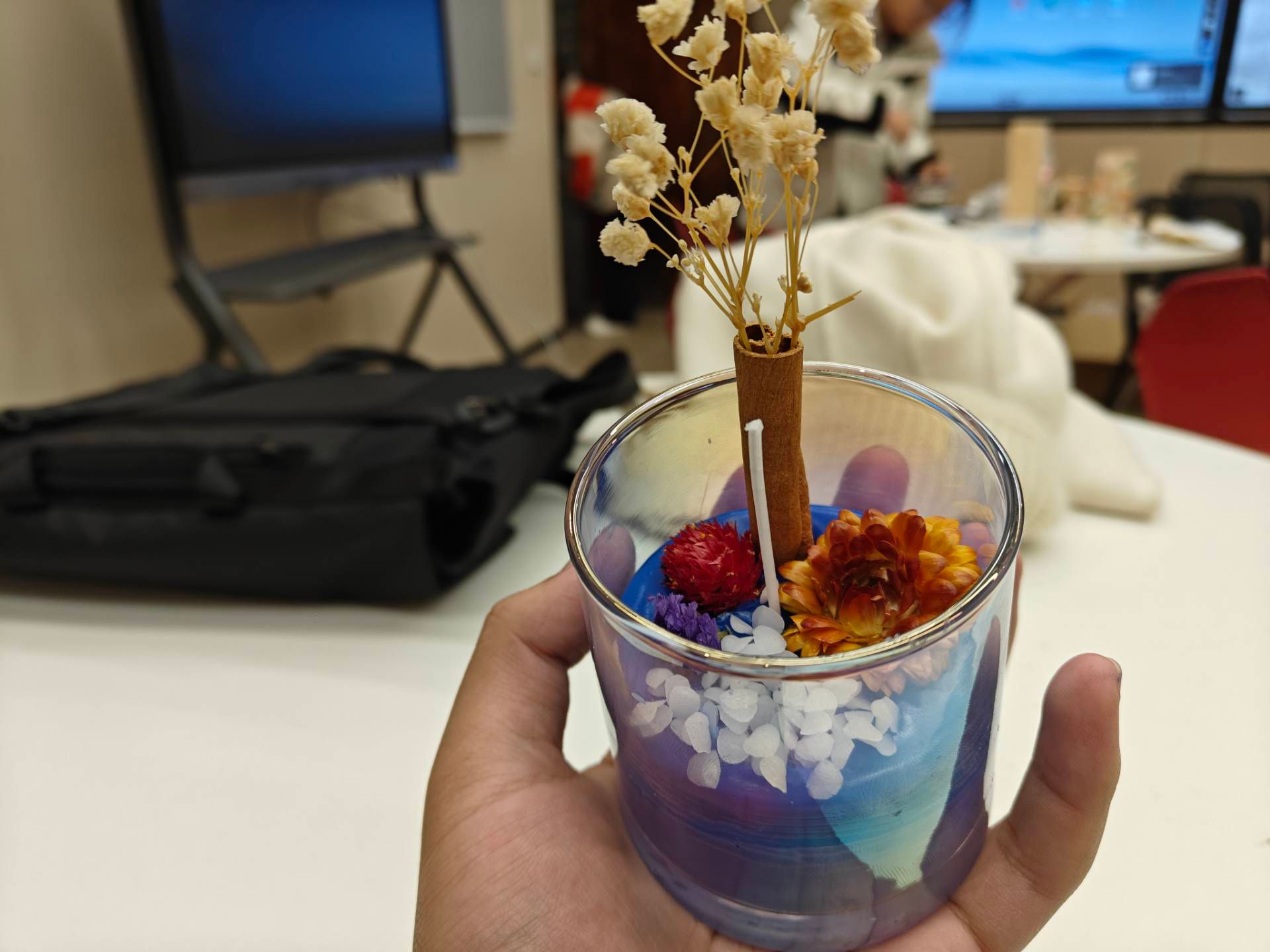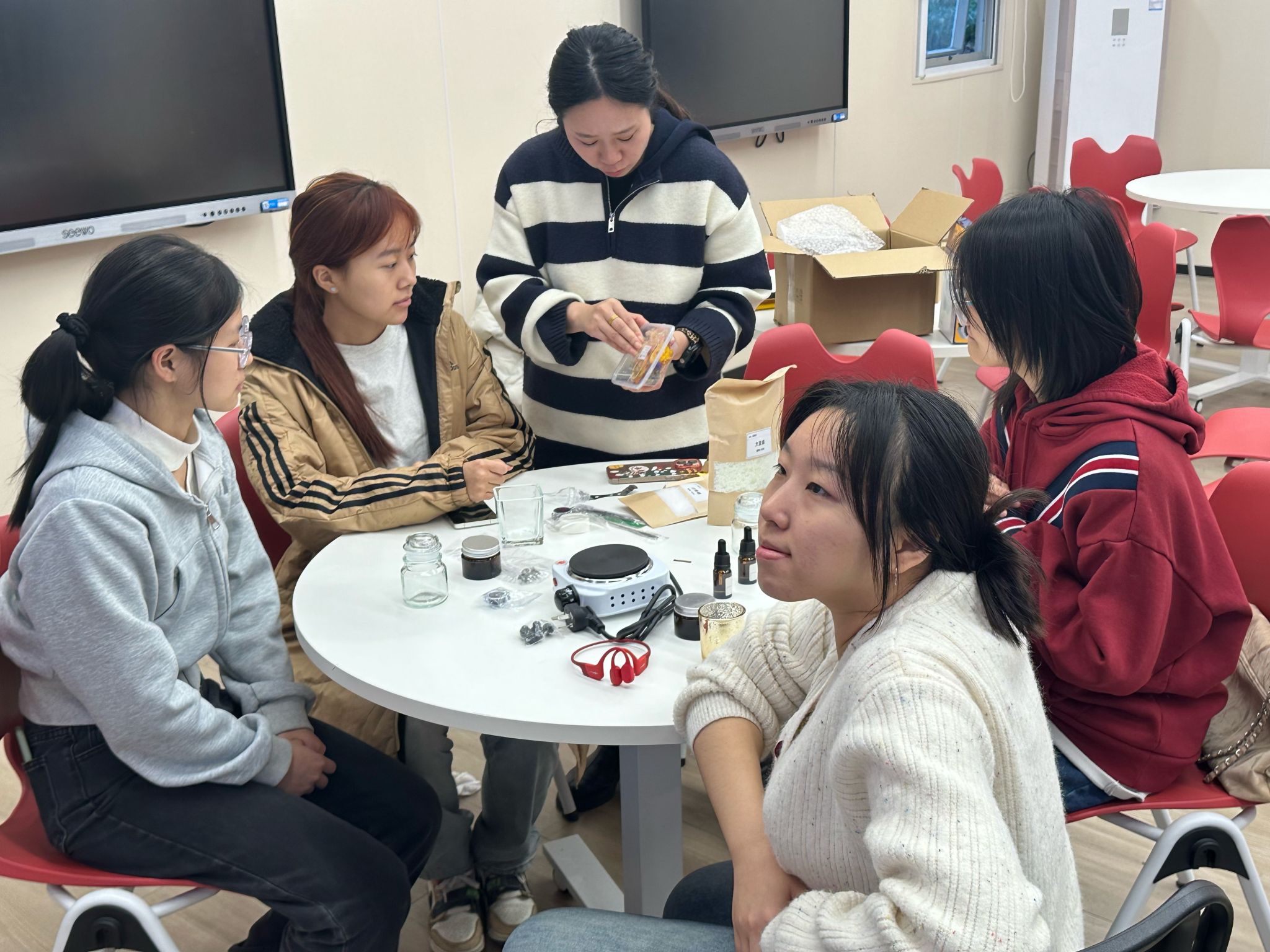 理论知识讲解完毕,实践环节随即上演。在戴华与朱姝霖老师的悉心指导下,同学们化身小小香氛师,挑选心仪的精油与装饰,将理论知识融入指尖艺术,从蜡油缓缓融化到蜡烛渐成雏形,每一步都凝聚着专注与创意。尽管初次尝试难免手忙脚乱,但正是这些不经意的小插曲,为活动增添了几分欢笑与温馨,让手作的乐趣倍增。