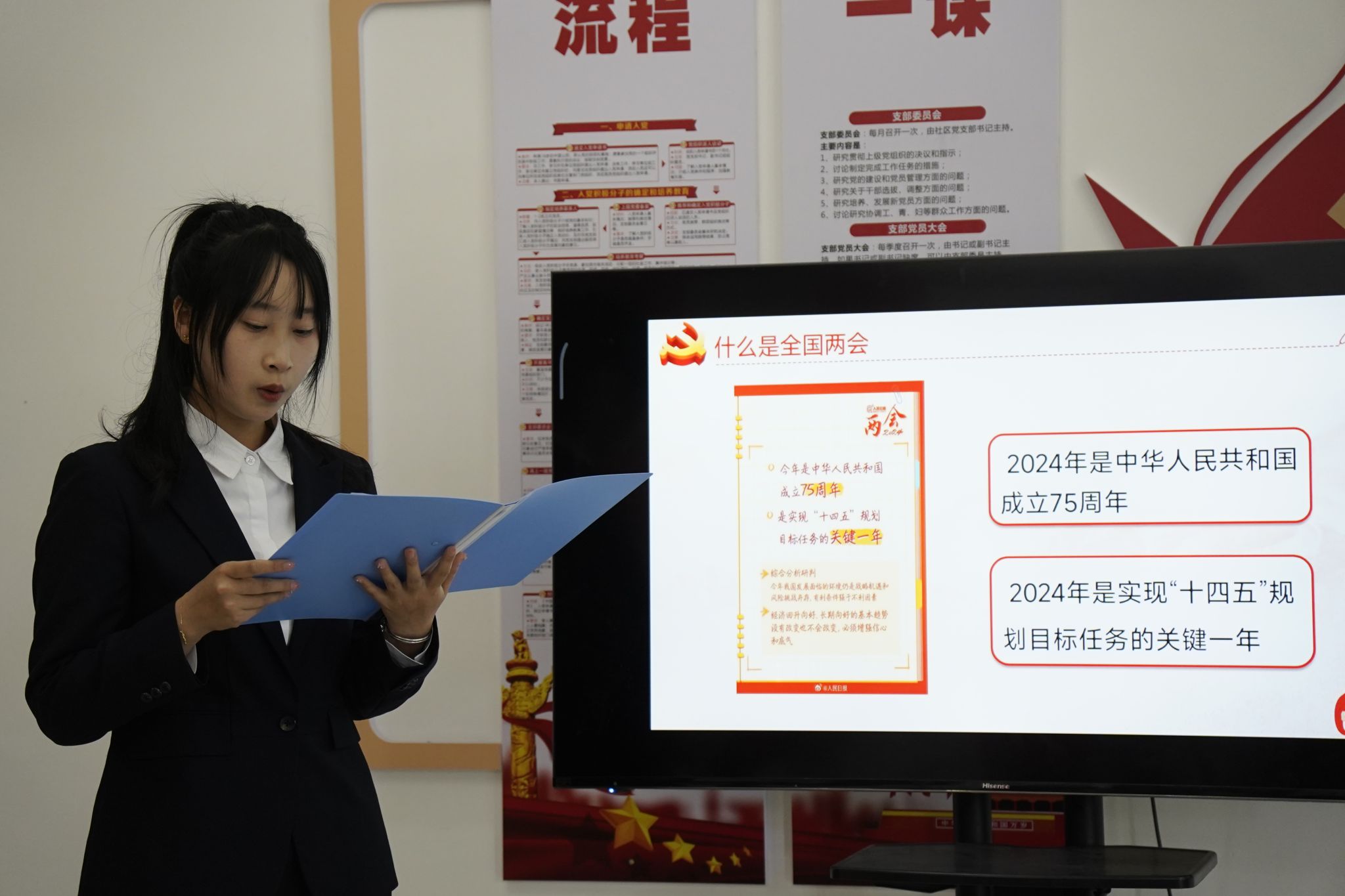 本次理论学习由党支部书记杨斌誉主持,学生党员彭诗懿和罗雨珩担任领学人。彭诗懿同志以“聚焦2024全国两会,奋进新征程”为题,深入浅出地阐述了全国两会的重要意义及其对国家运作的深远影响,强调了其对国家运作的不可或缺的作用。她不仅详细介绍了两会的核心议题,还深入剖析了2024年涌现的一系列“新词热词”, 包括“新三样”、“超长期特别国债”、“宏观政策取向一致性”等,通过生动的实例和深入的解读,使这些词汇背后的含义和时代价值跃然纸上。