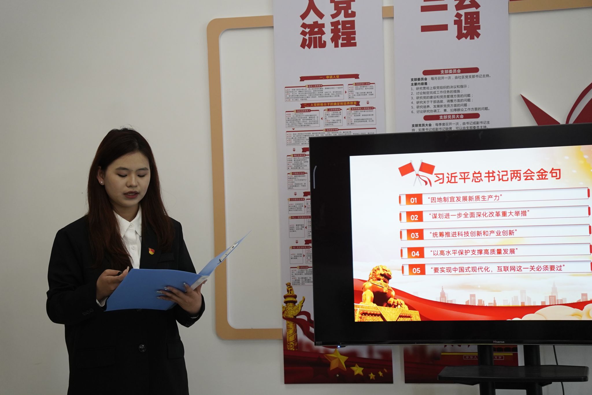 随后,罗雨珩同志以“读懂习近平总书记两会金句的重要指引”为主题,为我们解读了习近平总书记在两会上的重要讲话精神。她深入剖析了习近平总书记金句中所蕴含的深刻内涵,特别是对因地制宜发展新质生产力、谋划进一步全面深化改革重大举措以及统筹推进科技创新和产业创新等方面的论述,让在场的同志们深受启发。