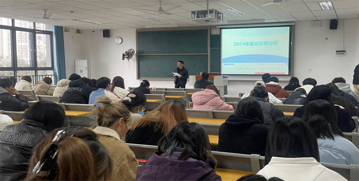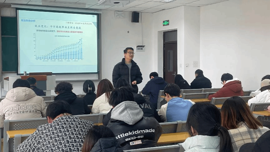 本次就业主题分享会的第二个环节是就业创业中心主任助理杨德龙老师以当前正在召开的全国两会相关报告和数据为背景,对当前就业形势的严峻性进行了深入剖析。他指出,我国大学毕业生人数的持续增加,使得劳动力市场上大学生的供给量显著超越了社会提供的职位空缺,企业招聘需求相对饱和。杨老师通过详实的数据揭示了不仅毕业生面临就业“寒冬”,我国企业亦遭遇生存挑战,普遍呈现出紧缩开支这一严峻态势的现状。