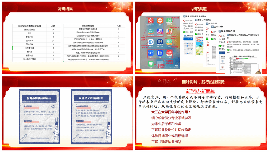 2月26日,远景学院2021级全体同学在智者楼306教室召开开学第一课。辅导员郭淼老师围绕电影《热辣滚烫》展开,从评说《热辣滚烫》的剧情理清外在刺激、内心觉醒和践行知行合一的关键并重新定义热辣滚烫;到邀请就职于百度的SRE工程师远景学院2022届霍之锐校友分享互联网行业的发展、现状、岗位职责、在校生能做的准备等思辨热辣滚烫;以及分享假期调研学生未来发展意向的结果和生涯规划案例引导同学们践行热辣滚烫。郭老师步步推进,帮助同学们更好地认识自己,明确未来发展目标。她重点强调职业规划的重要性,帮助同学们分类梳理了制定未来发展的关键步骤、当下要做的准备工作、以及了解求职信息的渠道,并介绍后期的帮扶规划和同学们的任务,提出了自己愿景和对同学们的美好祝愿,希望师生齐心即刻出发,积极拥抱变化,不断提升综合素养,直面热辣滚烫的人生!