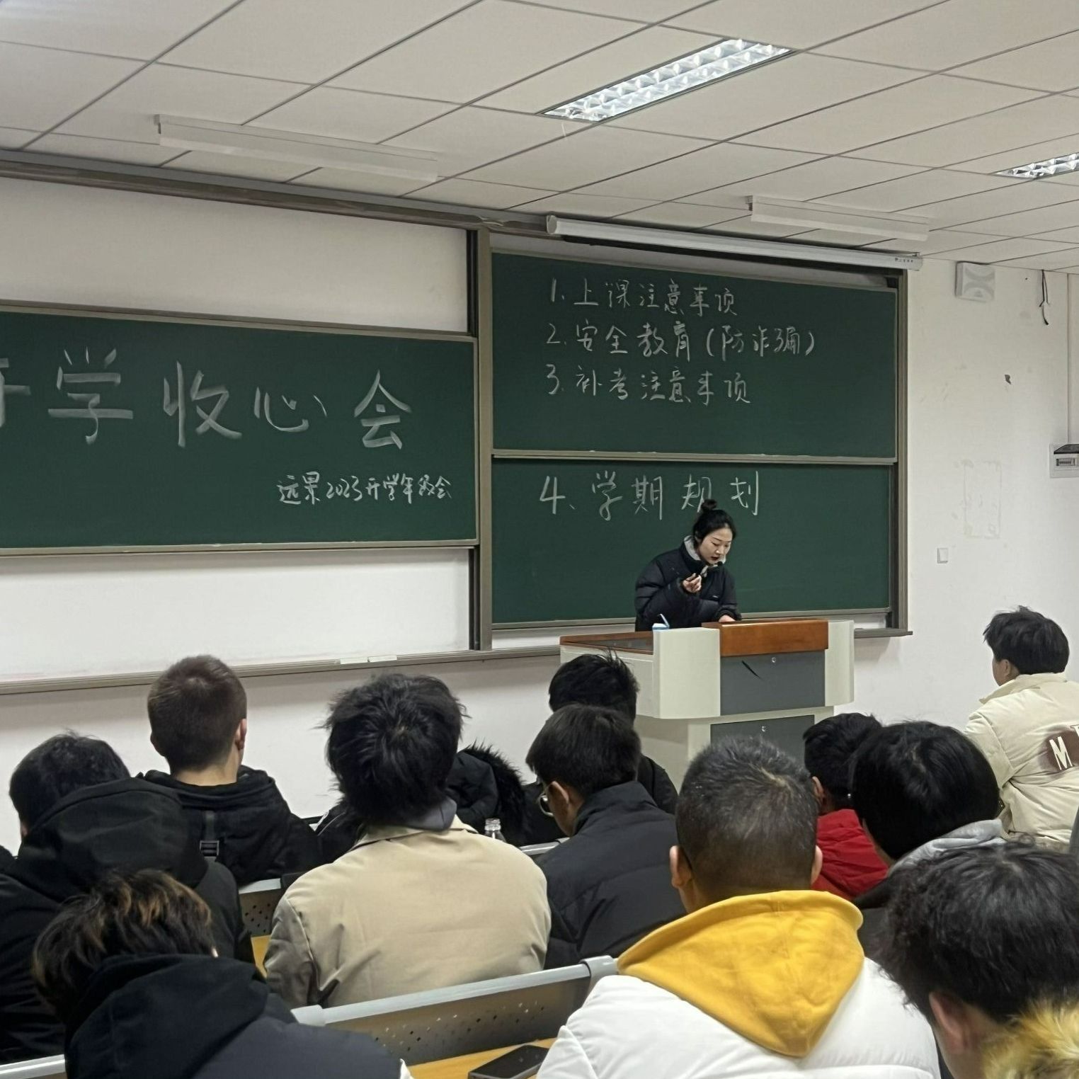 2月25日,远景学院2023级在9110教室召开了新学期年级会。本次年级会围绕四个方面进行,首先是强调新学期上课纪律,新年结束,新学期开始,辅导员向同学们着重提出上课要求,以便同学们快速投入学习状态。第二点是进行安全教育,特别是防诈骗相关教育,提醒同学们妥善管理和分配压岁钱,理性消费。第三点是说明补考注意的相关事项,提醒同学们及时查看补考信息关注补考安排,好好复习。最后是制定学期规划,鼓励同学们树立学期目标,寻找目标制定计划,度过充实而有意义的大学生活。