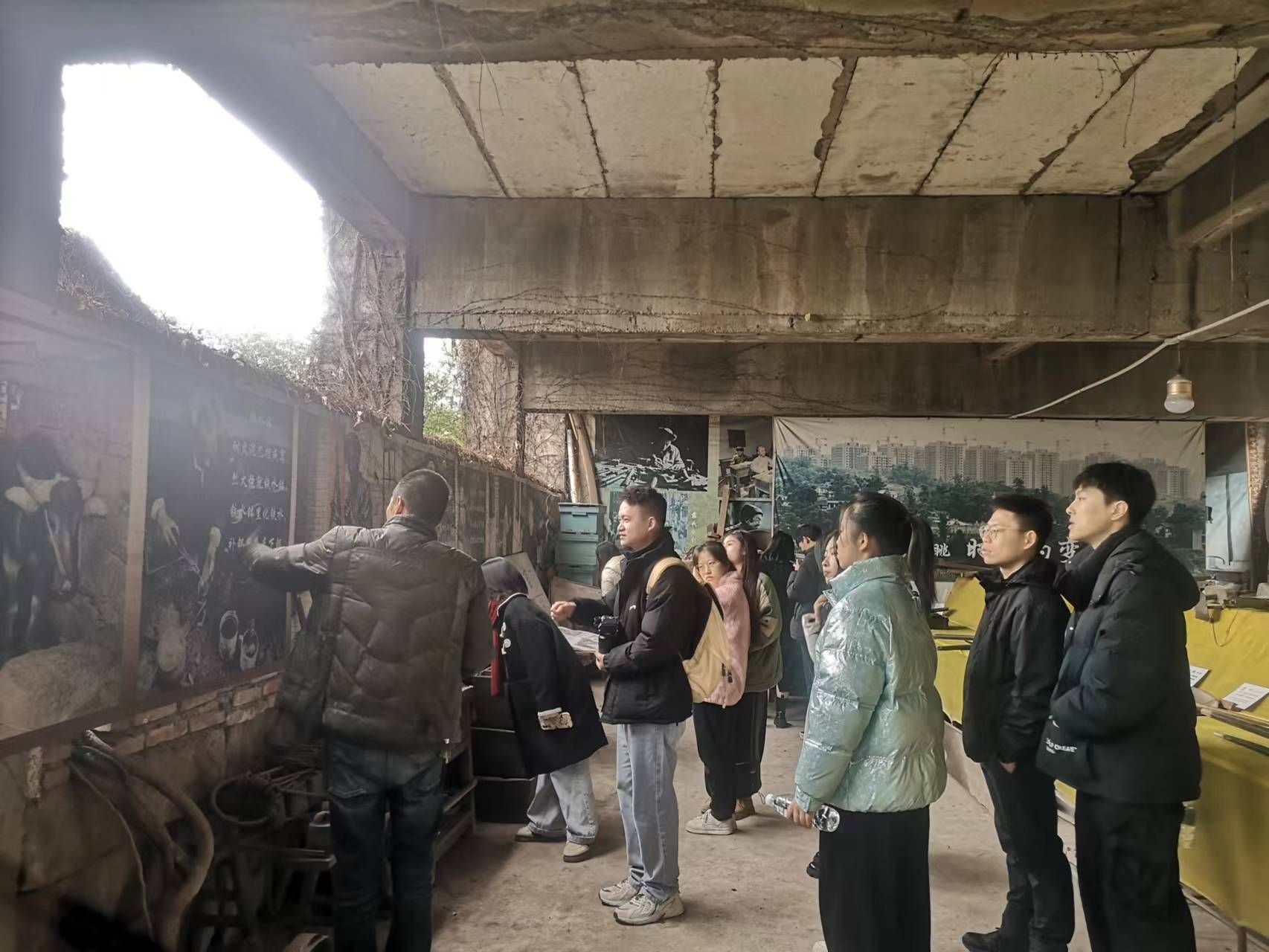随后,一行人在刘馆长的带领下正式开始考察活动,刚踏入陈列馆的大门,就有许多同学感叹:“哇,就像回到了我的老家!”院子里的陈旧摆设,摇尾巴欢迎的热情小狗,都让同学们感受到了如回到自己家中一般的亲切,紧接着,刘馆长热情地为我们介绍墙上的图片与诗歌,透过这张褪色的图片与刘馆长父亲所作的打油诗,同学们深刻感受到蔡家坪由上个世纪至今的快速发展,以及此间农耕文化的悠久历史。