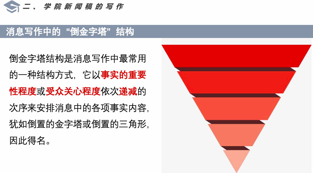 罗青老师作为从业6年的资深新闻人,其作品更是多次斩获省、市级新闻奖。在此次分享中他结合自身新闻媒体工作实践及众多报道实例,用生动诙谐的语言分享了当今新媒体时代下的新闻宣传写作技巧。在会议中讲到消息写作的“倒金字塔”结构方式是以事实的重要性程度或受众关心程度依次递减的,用正反两方面的案例展示了掌握正确写作技巧的实用性。最后,罗青老师给大家区分了“消息”和“通讯”的两种新闻写作类别,并用切实案例分析了会议新闻写作的注意事项和撰写技巧。