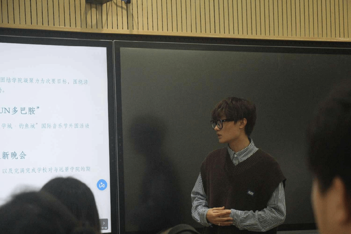 当日下午18:00,双校区师生于远景学院交流室开展了交流会。在交流会上,綦江校区的四位干部干事首先分享了他们各自部门在近一个月以来所承担的工作以及举办的活动中的经验与不足,收获与展望。潜行问学,方能究而达其深,从綦江校区三届四任团总支学生会主席邓玉婷对本月工作进行简单的阐述,到合川校区三届四任团总支学生会副书记黄加昊对一项项活动组织策划的总结与思考的句句真言;从青年志愿者协会开展的志愿者服务在冬日带来温暖,到就创助理团的工作经验使得同学们受益匪浅;从远景学院招新到破冰活动,从新生入院到远景学院学生酒会的成功举行......远景学院2023-2024学年“青马工程”初阶班开班仪式,“最青春”系列主题微团课,新生开学典礼,双选会,面试训练营等各项重点专项工作的成功举行和志愿服务活动、竞技体育活动、校园社团活动多向发展,同学们在工作中不断总结,在总结中创新工作方法、创新工作思路、创新思维方式,为团总支学生会的发展建设之路添上了浓墨重彩的一笔。