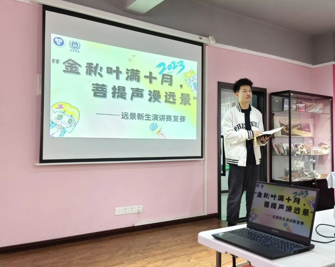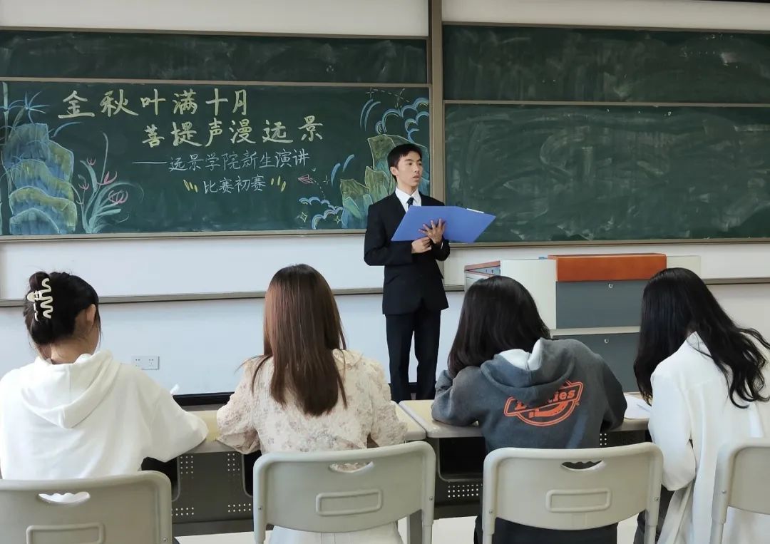 10月20日14:00,远景学院学习部举办的以“金秋叶满十月,菩提声漫远景”为主题的新生演讲比赛初赛在第九教学楼212顺利开展。初赛现场,2023级攻击124名选手全体参与演讲比赛,展现了逢山开路、遇水架桥的闯劲,全心投入不旁骛,满怀激情不懈怠的韧劲,无不体现出远景学子多样的精神风貌。初赛选手们就远景生活,人生观念,爱国情怀等多方面自选主题展开演讲。最后由八位评委评选出二十名选手进入下一轮比拼。