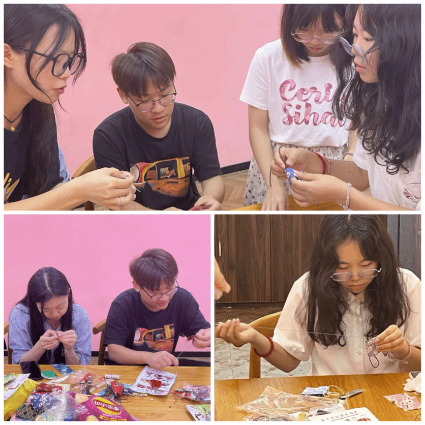 “日暖桑麻光似泼,风来蒿艾气如熏”,端午节来临时盛行佩香囊,寓意着驱邪避瘟。在煮粽子的空隙,大家拿出香包材料包,准备为自己或自己喜爱的人缝制艾草香包,寓意平安。“大家把包装打开,准备彩绳和布料......”黎美茜老师耐心地讲解着香包的制作方法,导师组成员纷纷动手制作起来,用不同样式的彩布、流苏和挂饰,一针一线仔细缝合。看着鼓鼓囊囊的小香包,成就感油然而生。大家纷纷表示,在此之前,从未碰过针线活,这真是一种别样的体验。