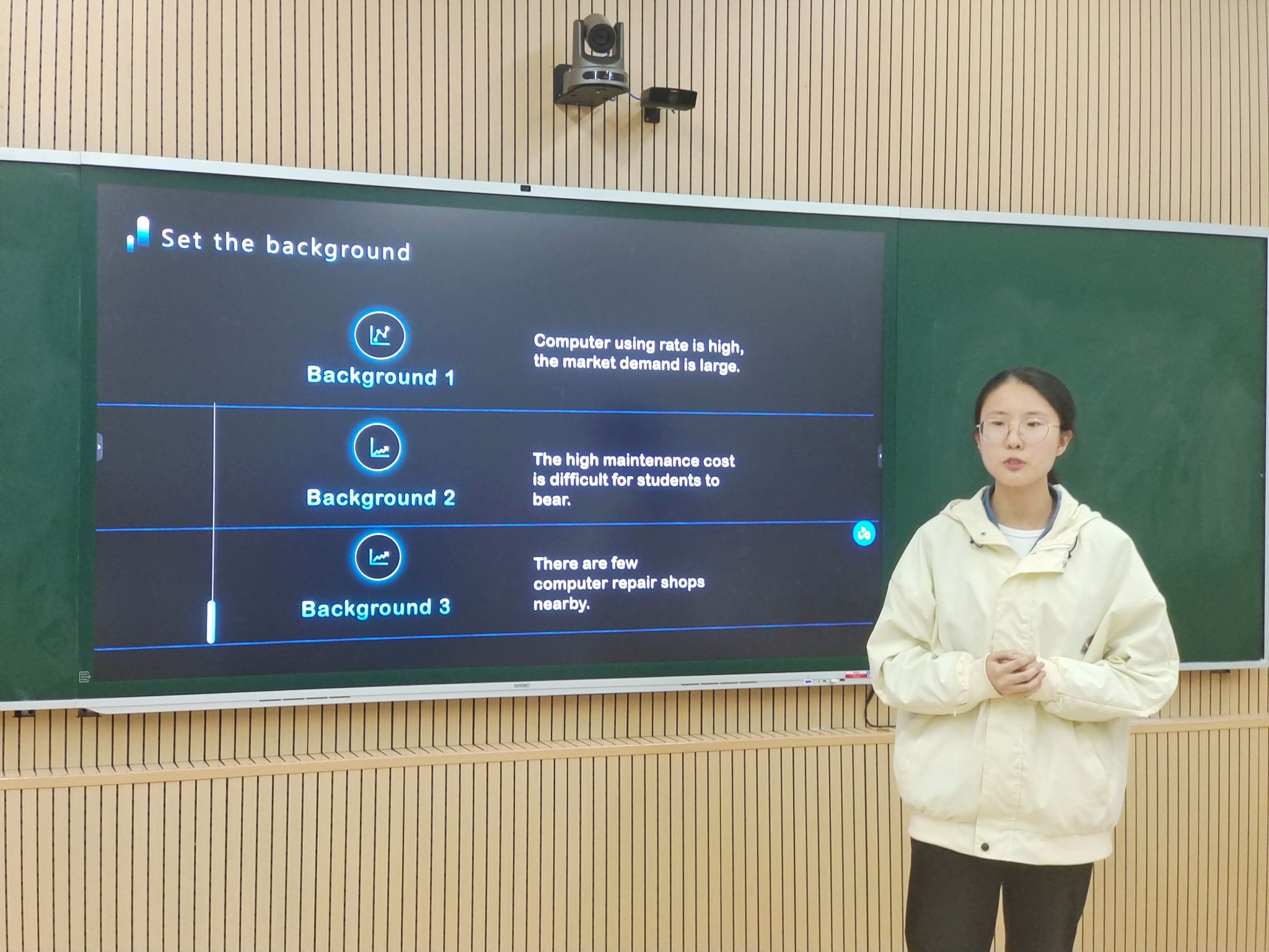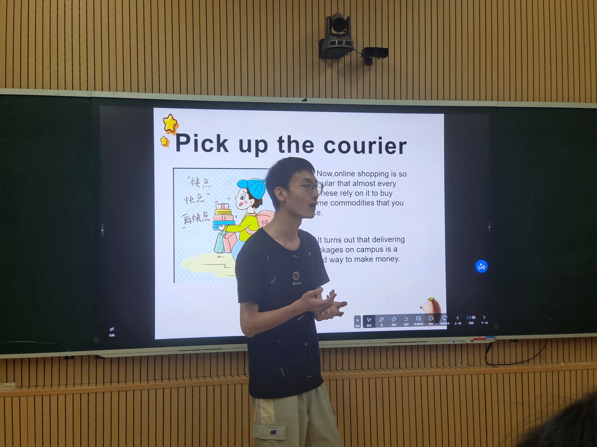 接下来,“代取快递”创业小组结合了同学们课业繁忙,快递点较远等的实际情况,向我们全面地分析了“代取快递”这一项目的营销策略。最后是“电脑维修”创业小组,她们准备充足,项目分工明确,利用安装软件的案例,引发大家的共鸣,项目展示人发言流畅,解说全面,给人舒适精彩的观感。各小组展示结束后,回味大家的项目展示,仍有余韵,让人不禁疑惑,赛事大奖究竟花落谁家?