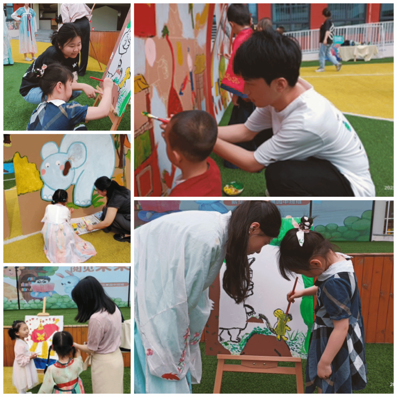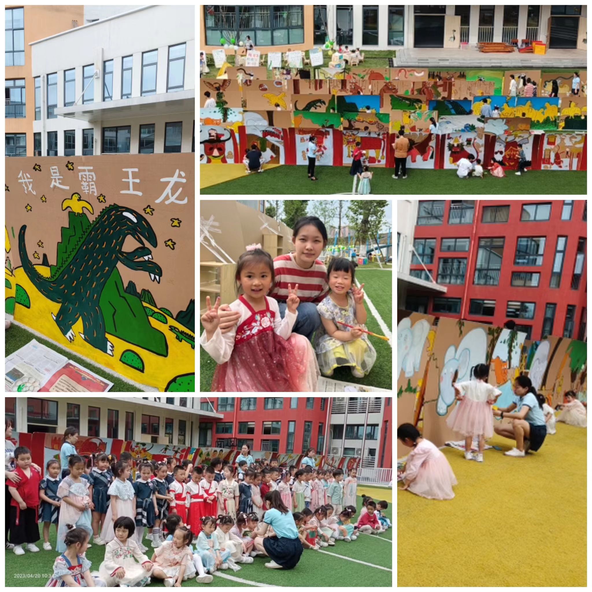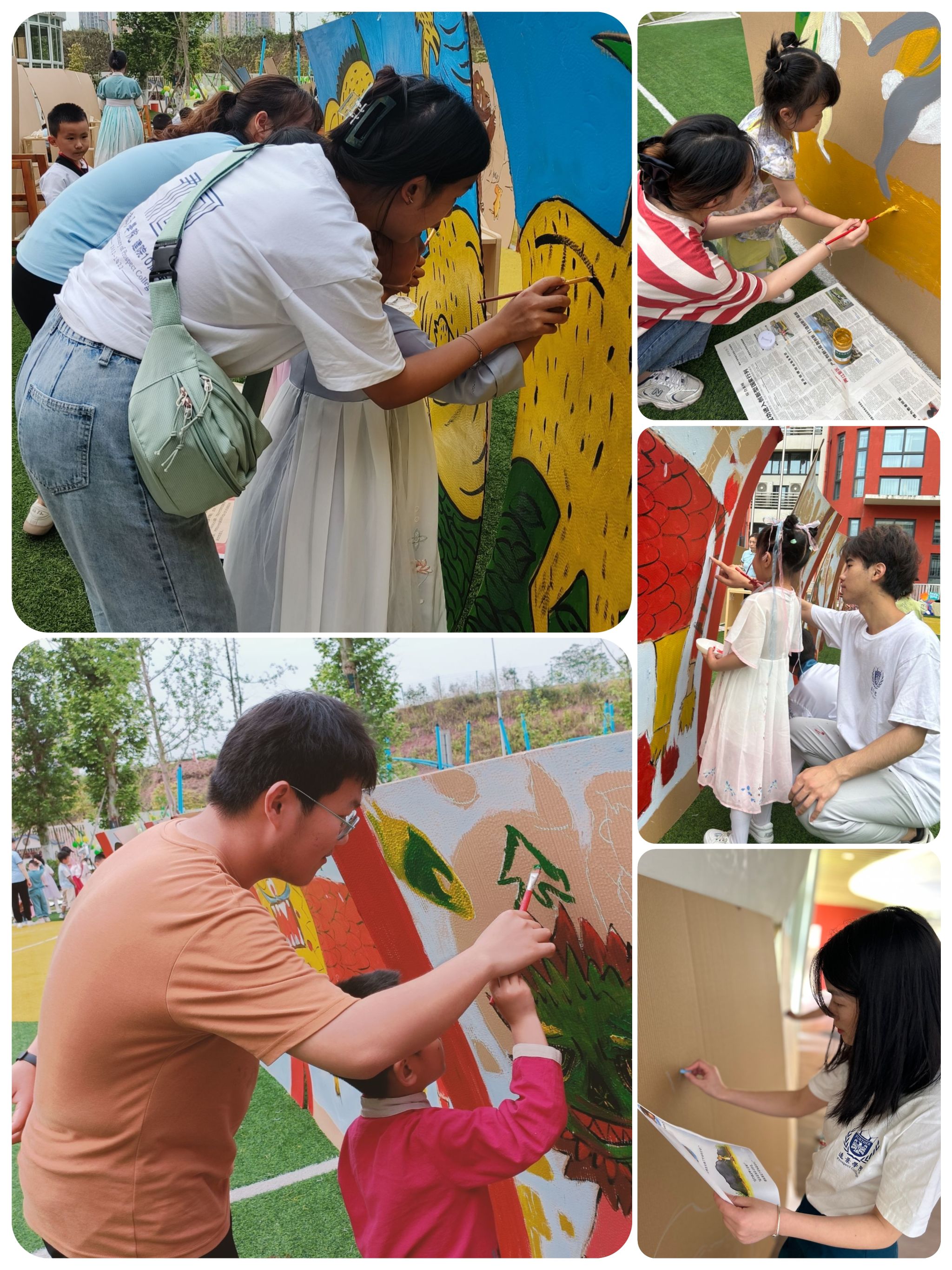 早在前一天,远景师生们前往新华幼儿园进行绘本创作,在长达十小时的时间里,师生们为小朋友们准备了2m*1.5m的50副分别关于“斗年兽”、“我是霸王龙”、“咕噜牛”、“丛林之王”、“美丽小兔”主题绘本。