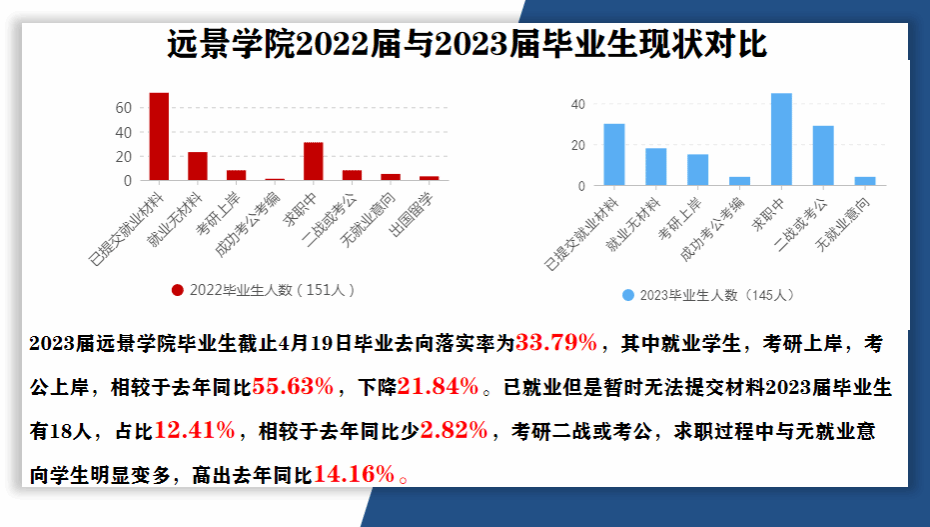 2023年全国高校毕业生再创新高,市场与企业环境也不太理想,李院长结合社会发展与时代现状,如就业群体结构性矛盾、预期与现实就业差异等问题,综合相关因素分析其带给大学生的就业影响。通过对远景学院2022届与2023届毕业生同期的就业形势对比以及就业情况概述,结合“辅导员+导师”信息反馈,李军院长表示,就业很难一步到位,即使经受挫折也要以积极正确的态度去面对,在尝试过程中不断认知、提升自我。