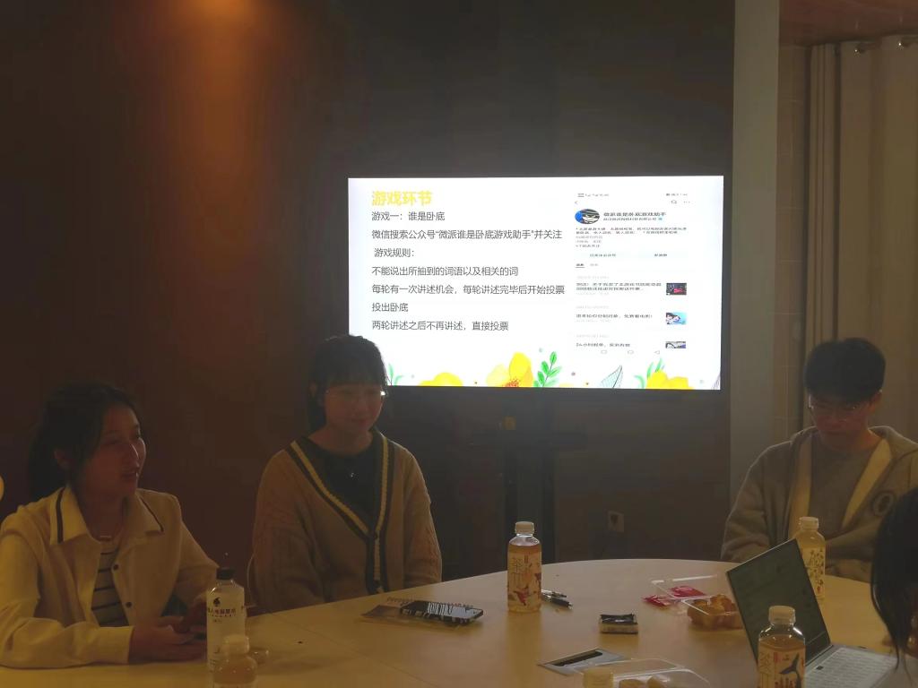接下来的环节是“谁是卧底”,陈玥导师带领学生们做趣味游戏,“卧底谜底”从体现传统文化的四字成语,到名人描绘,再到中外饮食和生活文化主题相关的词汇,不停变换,不仅增添了导师交流见面会的乐趣,也使我们彼此更好地融合,增进感情。
