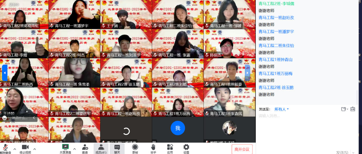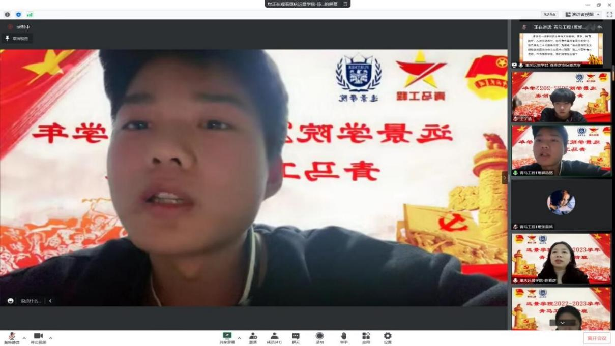 习近平总书记勉励新时代广大青年:青年兴则国家兴,青年强则国家强。当代中国青年生逢其时,施展才干的舞台无比广阔,实现梦想的前景无比光明。通过本期青马工程理论第一讲,学员们更加理解了时代的责任赋予青年,时代的光荣属于青年。新时代青年人应严格要求自己时刻保持学习的状态,用最新的理论知识武装头脑、用最强的理想信仰鼓舞精神、肯担当敢作为,时刻严于律己,为全面建成社会主义现代化强国、实现第二个百年奋斗目标添砖加瓦。