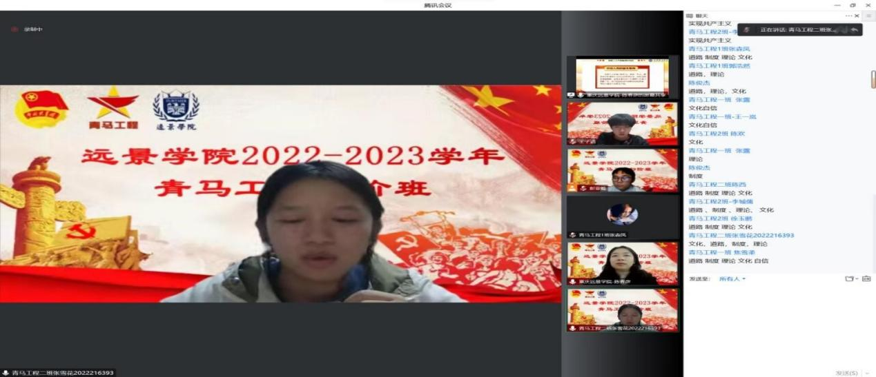 为深入学习、贯彻习近平新时代中国特色社会主义思想,深入实施青年马克思主义者培养工程,引领大学生骨干不断坚定理想信念、练就过硬本领、锤炼高尚品格,弘扬和践行社会主义核心价值观。2022年12月1日下午18:30,远景学院开展“守正笃实·日新其力”——2022-2023学年“青马工程”完满教育学生骨干培养初阶开班仪式暨理论第一讲。出席本次会议的嘉宾有远景学院学工副院长李军、远景通识教师党支部书记陈春彦、指导教师王诗颖及全体青马工程学员。