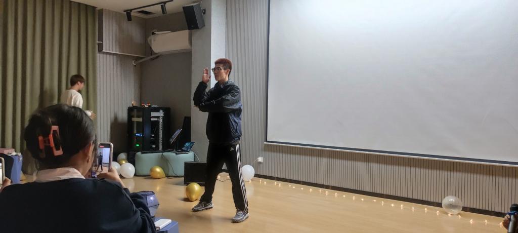 经过前期充分准备,黎老师和同学们共同设计了一个小舞台,鼓励每位同学勇敢展示自我。引导学生以脱口秀或才艺展现的方式介绍自己,促进同学们互相认识了解,同时也通过“抽奖”的惩罚小游戏进行互动。通过一系列趣味活动,师生共同参与,共同度过了一个美妙的开放麦之夜。