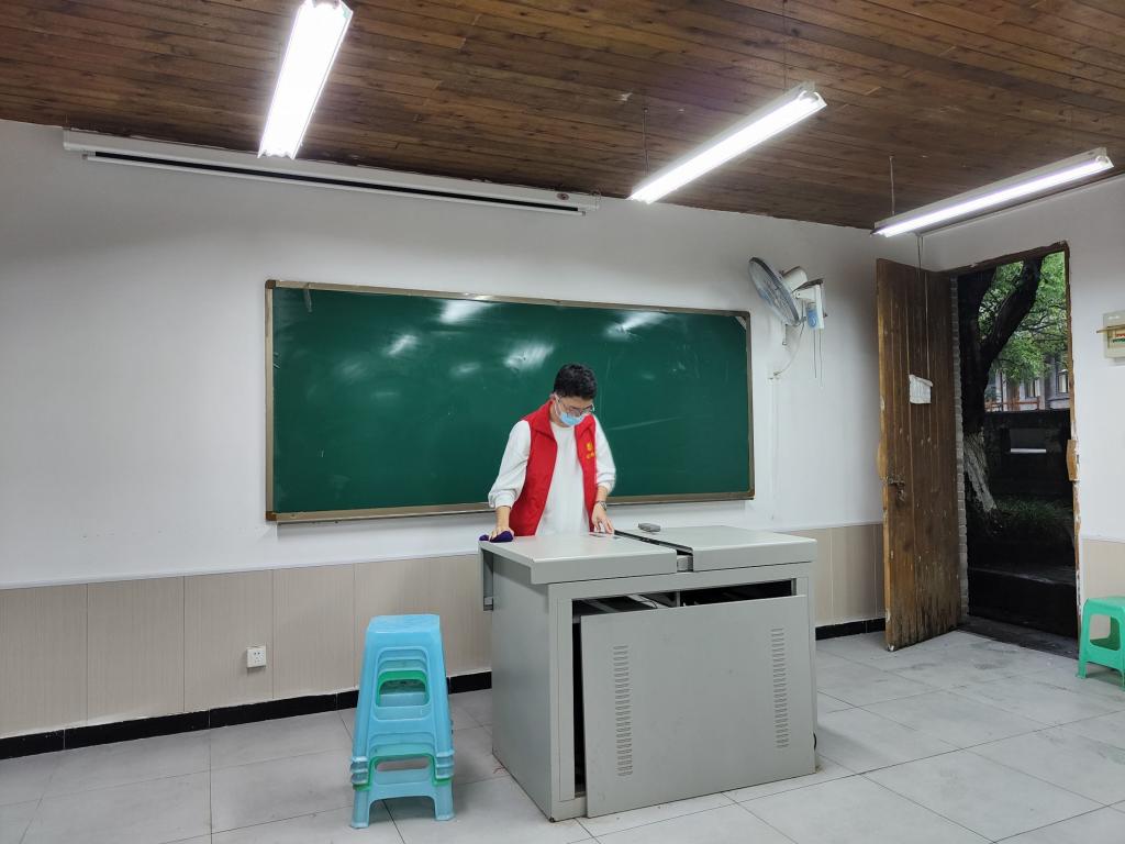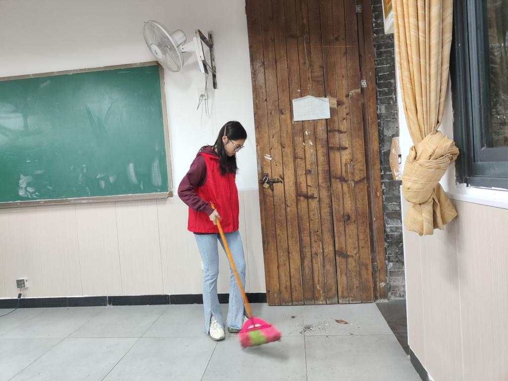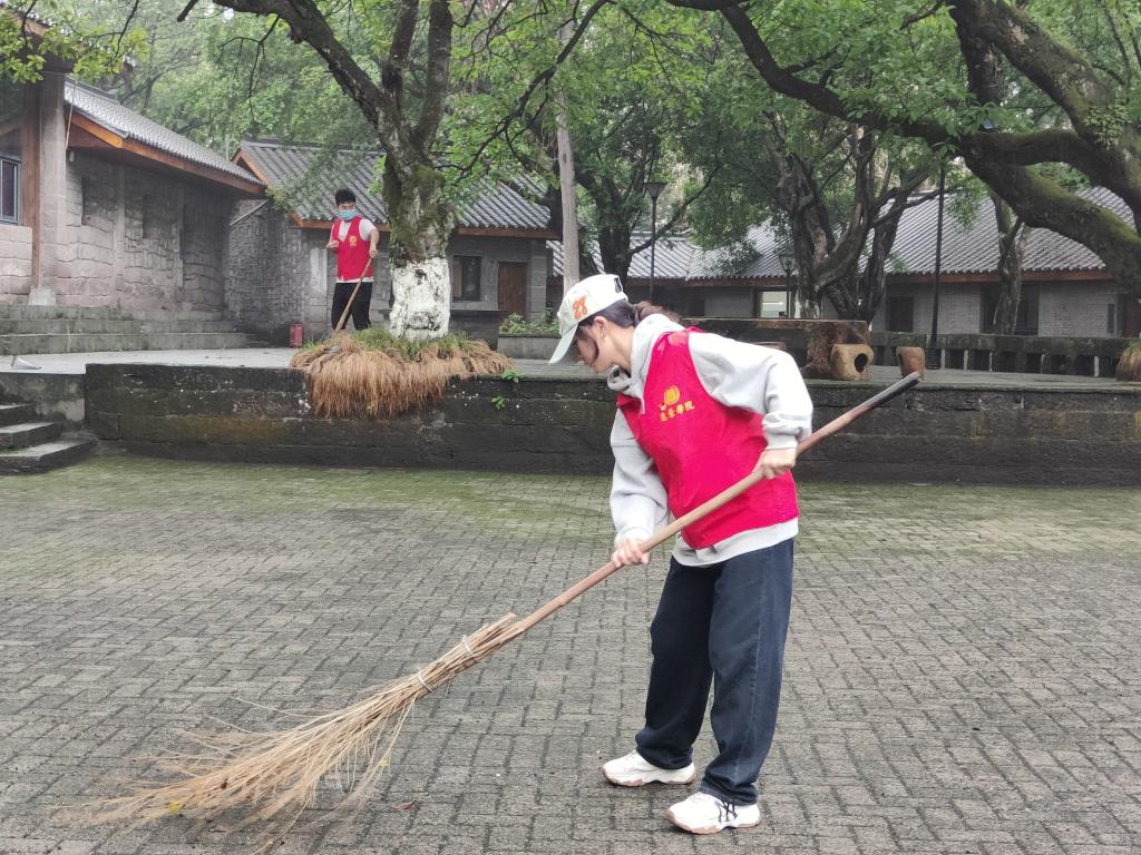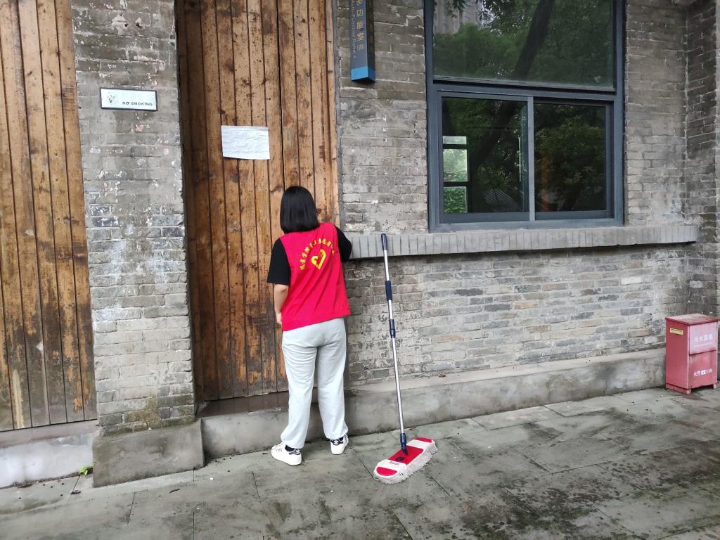 院内氤氲缭绕,雨水浸透了青苔,整个学院更加生机盎然。在本次活动中,为提高清洁效率,大家在不同的区域进行分工合作。学生党员们身穿红色的志愿服,手拿着扫帚,细细清扫菩提院子的每一处地方。从菩提树的落叶到地上沉积的泥土,从设施设备的检查到教室内部的整理和打扫,经过一上午大家的辛勤劳作,菩提书院的环境焕然一新。