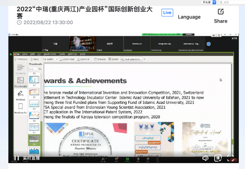 2022年8月22日以“为经济赋能,为生活添彩”为主题的中国国际智能产业博览会拉开帷幕。作为智博会重头戏,“中瑞(重庆两江)产业园杯”国际创新创业大赛同时展开激烈角逐,该项赛事由智博会组委会、重庆市科学技术研究院、重庆分享投资有限公司主办,马来西亚GITP、天马科创投、IBM两江数智e药+生态赋能基地、英国华人医疗信息协会、易智网、重庆移通学院远景学院共同协办,得到了两江新区科技创新局的大力支持。在由来自荷兰、瑞士、伊朗、南非、巴西、中国、爱沙尼亚、以色列、以及韩国的10个项目间展开了项目评比。远景学院朱雪珂、李梦瑶、唐智盟、谭星老师及其导师组成员受邀作为高校代表参与线上观摩,并在会后与选手及主办方进行交流。