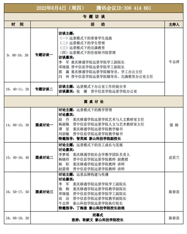 专题访谈环节共分为两个场次。访谈由泰山科技学院远景学院牛志萍主持,重庆移通学院远景学院的学工副院长李军、晋中信息学院远景学院学工副院长邓瑞强和分别来自两校的辅导员郭淼及闫帅就荣誉学生选拔制度、远景模式下的学生管理、远景模式下的完满教育工作以及住宿制书院管理等方面进行访谈分享。第二场访谈围绕远景模式下的办公室工作展开,晋中信息学院远景学院办公室张璐作为访谈嘉宾对她六年的办公室工作经验进行了详尽分享,并与新远景团队同岗位教师展开互动交流。