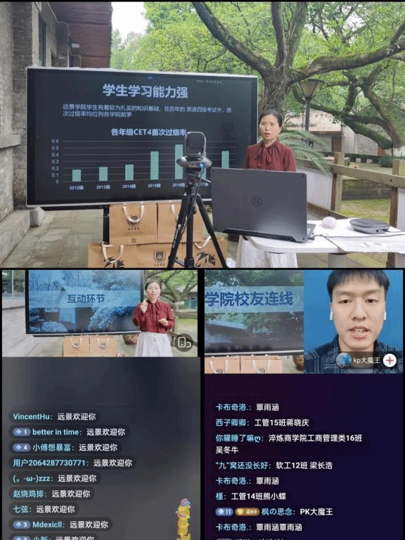 今年学院也创新宣讲方式,通过直播宣传,沟通零距离。远景学院执行院长皮若兰在5月20日、5月21日面向綦江校区所有学生进行直播宣讲,给大家全面介绍远景学院。直播围绕学院教学师资、教学特色、教学成效等几个方面进行讲解,解读了招生政策、选拔流程。且邀请到了优秀校友进行交流,旨在于通过朋辈互动的方式导航,增进同学们对学院的进一步了解。直播最后,皮院长针对大家关注的高频问题进行答疑。此次直播现场互动热烈,受到了同学们的一致好评,统计显示,此次直播累积人次达3000余人,点赞达五万多次,现实了綦江校区新生全覆盖。