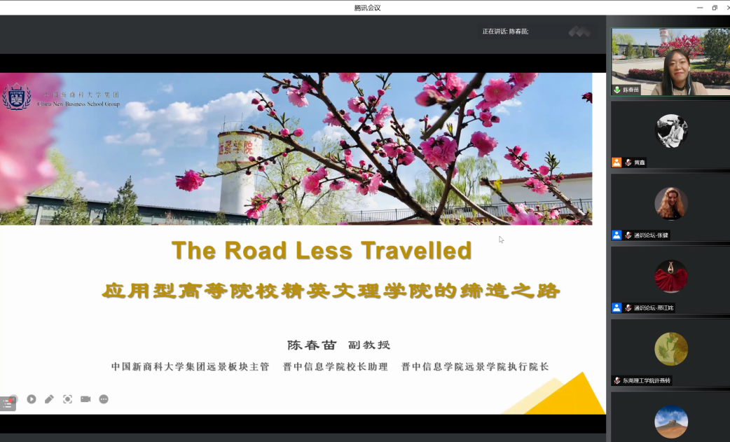 远景板块主管、晋中信息学院陈春苗老师则以“The Road Less Travelled——应用型高等院校精英文理学院的缔造之路”为题,通过“厚植博雅,深耕文理,双子远景落地晋渝;纲要引领,理念前瞻,育人目标清晰可及;本土育人,全球智慧,专家团队遍及世界;七化为经,三制为纬,育人模式革故鼎新;融合通专,互联三校,外邀嘉宾共唤卓异;品牌立院,内涵发展,十年奋楫成效初见”六个部分,全面生动的讲述了晋渝两校远景学院十年的探索与实践。
