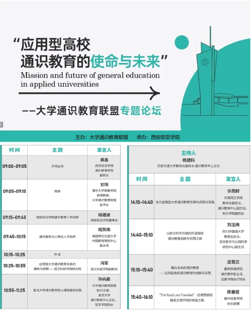 此次论坛以“应用型高校通识教育的使命与未来”为主题,目的是探索应用型高素质人才的培养,以及应用型高校通识教育的有效开展。5月28日上午的主旨论坛,由西安欧亚学院通识教育副院长黄鑫主持,大学通识教育联盟秘书长、清华大学新雅书院讲席教授甘阳致辞,随后西安欧亚学院董事长胡建波、大学通识教育联盟执行主席孙向晨、哥伦比亚大学中国研究中心副主任程贺南等嘉宾,均做主题发言。5月28日下午,论坛分别以“应用型高校通识教育的管理之道”和“应用型高校通识教育的课程实践”为题,汇集来自包括重庆移通学院、晋中信息学院、四川外语国语大学、东莞理工学院、武汉商学院等应用型高校的代表,进行了主题分享与深入讨论。