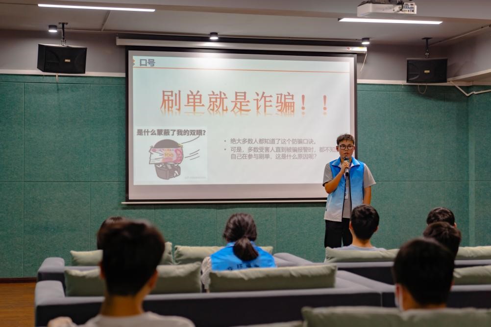 结合电影,猫头鹰反诈志愿服务支队对现场同学进行了防诈骗宣讲,以小情景剧的形式向大家绘声绘色的介绍了当下包括退税诈骗、中奖诈骗、培训诈骗、家人遭遇意外诈骗、朋友急事诈骗在内的十余种新型诈骗方式。在宣讲完毕之后,支队同学与在场的同学们进行了互动交流,同学们积极举手提问,宣讲人也耐心地对同学们的疑惑和想法一一作出回应。对于一个同学提出的“是否只要不相信天上掉馅饼,就不会掉入诈骗陷阱”等问题,宣讲人也给出了自己的见解,他表示这样会有极大概率保证自己不会上当受骗,但是也要注意网络上的二维码、链接,不要随便去扫,这些隐患也有可能造成财产损失。 最后,支队宣讲人特别叮嘱同学们在生活中要擦亮眼睛,防范电信诈骗,与家人朋友们谨记要做到“三不一要”——不听、不信、不转账、要及时报案。