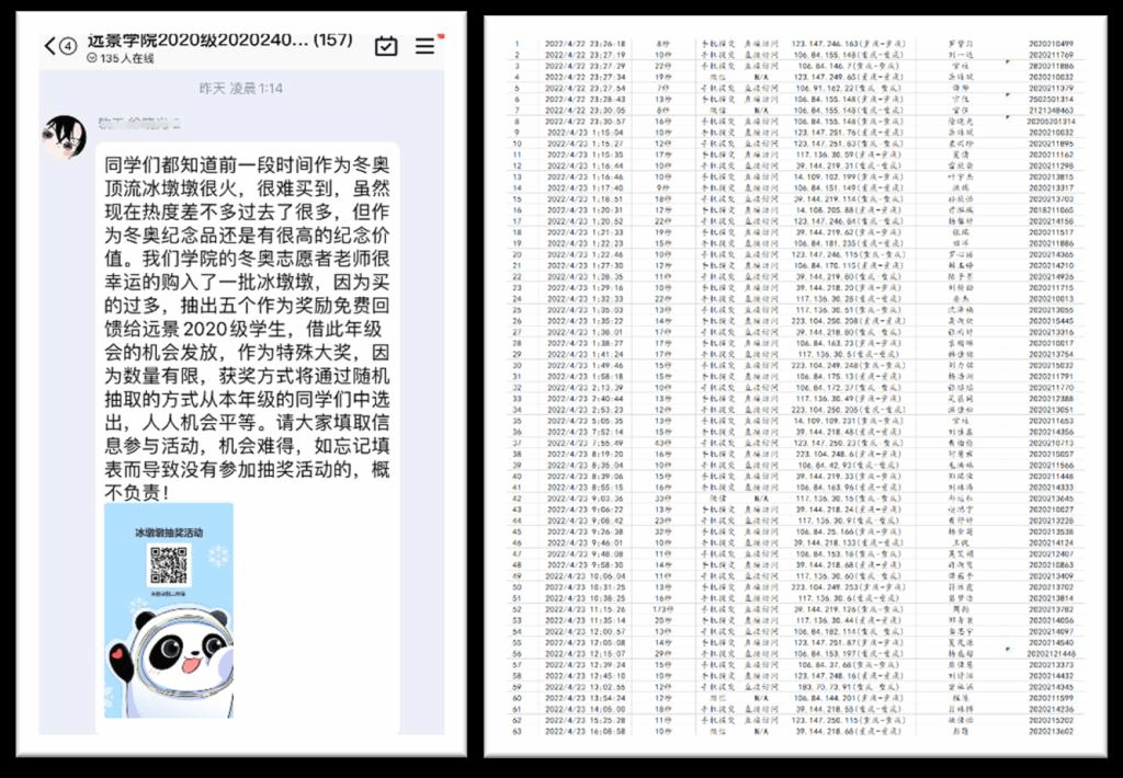 年级会因为抽取‘冰墩墩’而开始让人期待,同学们众口嚣嚣的走入会场。据统计,约有40%同学扫码填写此链接,链接涉及学生的姓名、学号、IP地址、提交来源……。细思极恐,原来学生的信息如此容易获取……