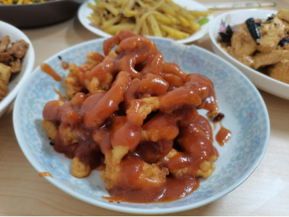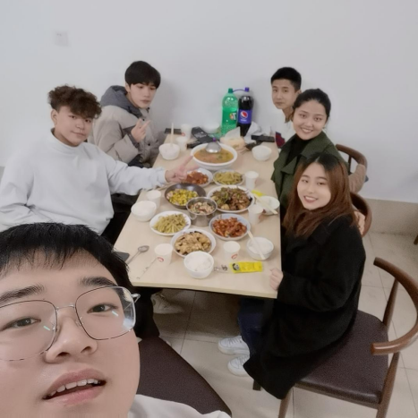 采买完,透亮冷冽的街道上,是几人大包小包,有说有笑的身影。嬉闹着,调侃着,那笑声,染的周边的空气都跟着温暖了起来。在这样欢快温暖的气氛里,大家终于顺利会师,集结到了远景楼厨房。至此,厨艺比拼的序幕也正式拉开,大家各自忙碌,有条不絮的准备着自己的拿手菜 - 小炒、烩菜、蒸煮、煲汤,炊烟袅袅,好不热闹。最后,在老师的带领下,大家一同努力,历时一个半小时,一道道美味的特色菜都成功上桌。这里有东北名菜-过油肉,有重庆特色-冒菜,有家常小炒-酸辣土豆丝,还有李晨晓老师倾情烹饪的糖醋里脊。满满一大桌,可谓是,各有千秋,各自美味。大家更是享受着这种家庭般的温馨。经过,中午一道道各具地方特色的菜肴端上了饭桌。李晨晓老师也特意为导师组同学制作了糖醋里脊。欢聚时刻,同学们互相分享最近的乐趣之事、部门生活以及自己的成长之路。欢声笑语中,一切苦与乐都化成自己的经验和饭后闲谈的话题。