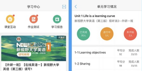 时代的进步与信息技术发展使新一代大学生的学习方式不断变化,传统的课堂以教师讲授为主,授课形式单一、学习内容枯燥。U校园平台的智能语音评测、智能写作评阅等人工智能技术,辅助学生自主训练,提供即时评价反馈。远景学院使用的新视野大学英语教材与U校园教学平台的云内容一一对应,通过融合丰富的学习资源和便捷的学习手段,为学生的多元化选择和学院的个性化培养提供了条件。