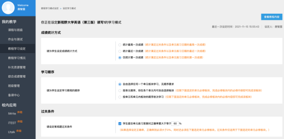 在第四单元的学习中,教师首先在U校园平台对成绩统计方式、学生学习顺序、必学与选学内容,以及过关条件进行了设定;学生在规定的时间内,可结合自己的学习习惯和基础水平,按照自己适应的速度进行学习。