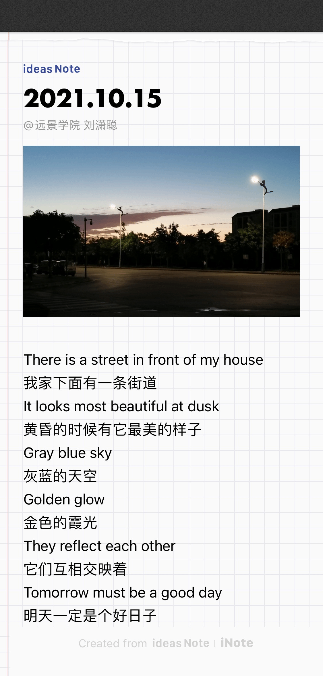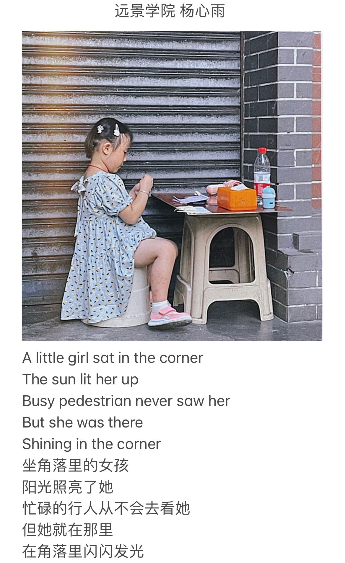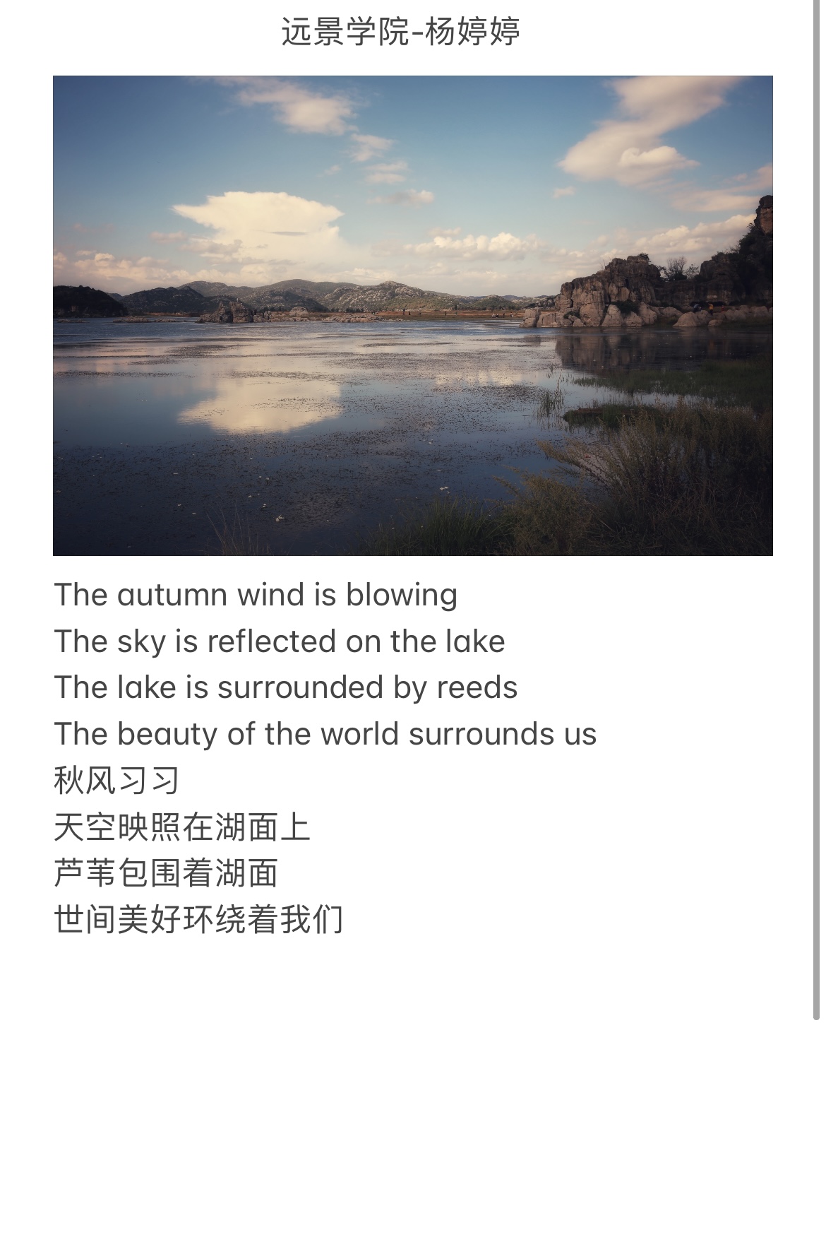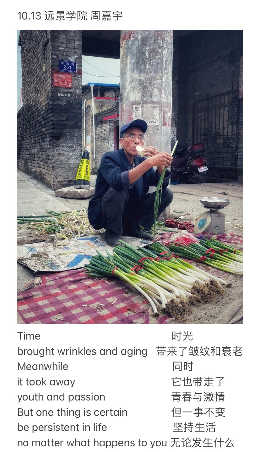 这是一个思想自由的年代,新一代的大学生们希望得到更多实践的机会可以发挥他们的创造力和想象力。本项目作业由远景学院《大学英语》授课教师戴华发起,希望通过原创双语诗歌摄影的活动给同学们一次展示自我的机会,让大家在领略诗歌魅力的同时提升英文水平,让自己更加自信。