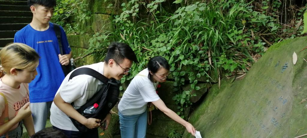在观赏摩岩石刻时,黄煌老师指出“钓鱼城”中 “鱼”字的“三点水”书法的内涵,示范英语翻译如何把这样的“汉字梗”给解释出来,并教授同学们汉字偏旁“两点为冰,三点为水,四点为火”的“指事”功能翻译,更加贴切的介绍钓鱼城故事;冯老师则以护国门及其周边遗址为例,讲解“怎么分辨宋代钓鱼城与清代钓鱼城”的问题,之后又结合道教的石像以及悬空卧佛等,讲解应当如何理解、介绍中国人的传统宗教信仰;当场便有学生提出佛寺和道观在中国的并存就如同“在肯德基的旁边必有一家麦当劳”的和谐共处一般。