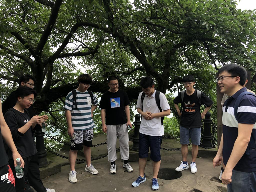 同学们边讨论问题,边沿着登山步梯爬山,在到达钓鱼城的核心区域之后,冯老师请同学们回顾了之前课程中的问题:“为什么登山步道的边上,会有许多的石孔?”,“应该怎么理解钓鱼城36年抗敌?”,“九口锅是用来干什么的?”。同学们都很自然地侃侃而谈,不用老师点名便主动开口分享自己的想法,结合课堂中讲的知识点和参观了实地景点的体验,有创造性地提出自己的看法或者调侃,甚至还搭配有动作表演进行解说,有些想法还引发了大家的捧腹大笑。
