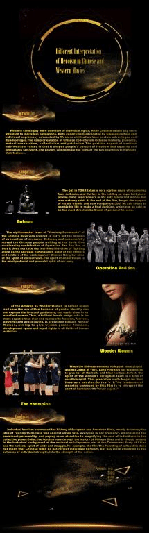 通过对中西方电影中的对英雄的不同定义,此研究海报试图归纳出中西方英雄形象各自的特征和内涵,并对英雄主义不同表现形式进行解读。中西方电影在英雄方面的差异不仅反映出东西方电影模式的不同,更从本质上反映了中西方文化对英雄人物的不同看法,进而反映了中西方的文化差异。其中一个明显的差异是西方电影的英雄具有强烈的个人英雄主义色彩,而中国电影塑造的英雄一般是一个群体或一个阶层。如今,英雄主义越来越具有全人类的广泛精神意义,希望可以通过对比中西方差异过程中形成相互尊重的英雄主义价值观。