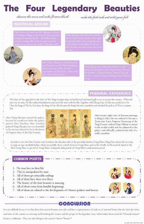 西施、貂婵、王昭君、杨玉环是尽人皆知的我国古代四大美人。虽然她们的美貌今人谁也没见过,但关于她们的故事与美貌的描绘仍是不行胜数,世人百看不厌,百说不烦。古往今来的文人墨客不乏也为其作诗赞其美貌及气节,例如:“眉黛夺将萱草色,红裙妒杀石榴花。”“千载琵琶作胡语,分明怨恨曲中论”“莺歌思享关公眸,娇嗔欲夺云长目。”“云想衣裳花想容,春风拂槛露华浓”等等。通过对中国古代四大美女的展示,是想要外国人透过她们的故事更深层次的理解中国古代女性的“忠”“德”“义”“情”。