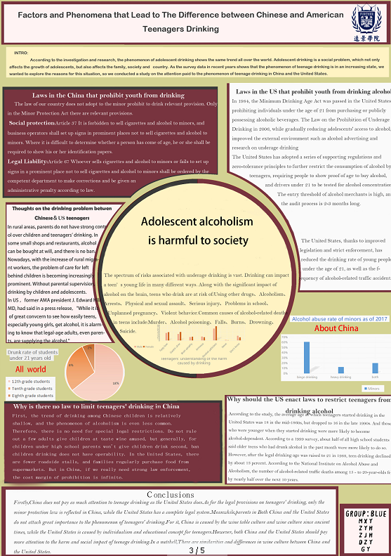 如今,青少年酗酒已经成为严重的社会问题,不仅对青少年成长有一定的影响,还会对家庭甚至社会产生影响。通过展示中美青少年饮酒现状,分析导致中美青少年饮酒差异的因素,以及酒精成瘾的后果,让更多人对青少年饮酒行为进行多元思考,有助于降低青少年饮酒风险。