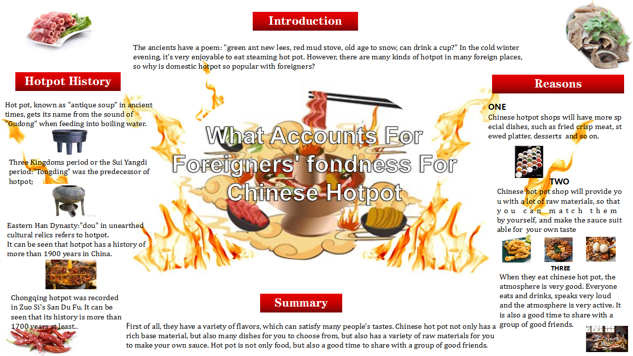 选择“中国火锅文化为主题”是因为中国饮食文化源远流长,而火锅作为一道具有代表性的美食,更是具有其独特的魅力。通过对火锅历史的追溯到分析外国人偏爱火锅的原因,火锅已然成为全球化的一种文化表现形式。如今,饮食全球化已成为一种发展趋势,而作为中国人的我们可以通过英语弘扬我们的传统美食,让中国饮食文化闻名海外。