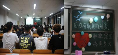 同学们早早来到教室,利用手绘板报和气球横幅等装饰将年级会会场营造出轻松、暖心的氛围。同时由年级同学自编自导自演精心制作的微电影《寝室风云》也以诙谐的开场将同学们引入主题,一阵阵鼓掌和欢呼表达了同学们对微电影的认可。