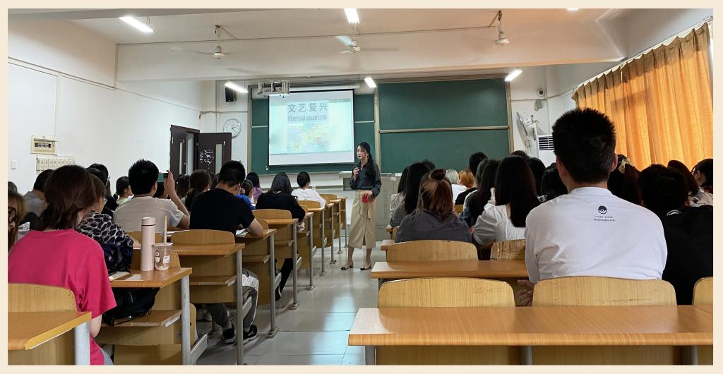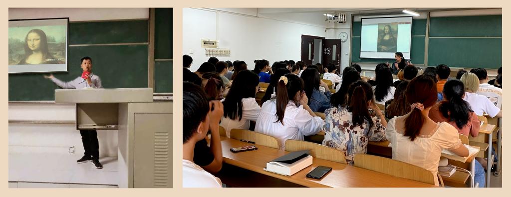在新文科建设背景下,为了探索人文艺术类通识课程学科融合教学新模式,推动通识课程教学创新,提升学生跨学科认知能力,5月14日下午,在1409教室,通识教学部《欧洲文明的现代历程》课程教师颜昌义与远景学院《艺术史》课程教师赵丹开展了合作教学实践,共同为同学们讲授了“历史与艺术作品中的文艺复兴”相关内容。