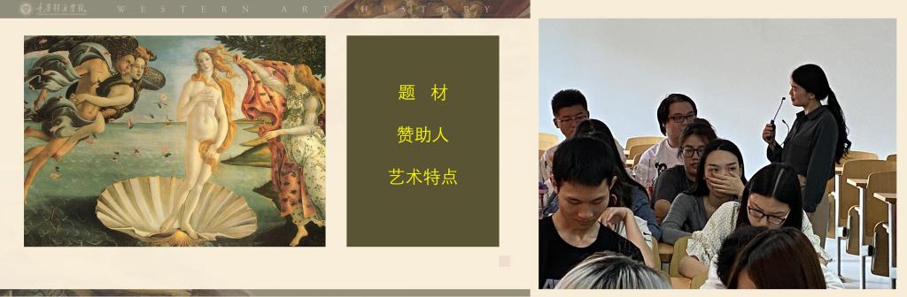颜昌义老师首先从城市国家、商业经济繁荣、思想转变、历史遗产等方面讲解了意大利文艺复兴兴起的大背景。然后,赵丹老师以波提切利的作品《维纳斯的诞生》为切入点来回应历史,提问并与学生互动:“一提到文艺复兴你会想到什么”、“艺术与历史有什么关系”、“艺术与文明进程的关系”。在讲解的过程中,赵老师以作品的题材、赞助人、艺术特点三个方面来引导学生理解“艺术——历史”,其中也包含了“如何正确地欣赏一幅画”的子问题:题材从whe