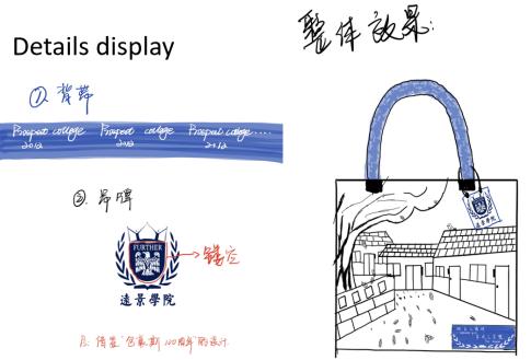 第三小组介绍了“远景学院帆布包”设计的设计灵感、设计理念、细节展示和成品展示。帆布包的手绘图灵感来源于远景学院实景拍摄,更具有实际意义,房顶砖瓦的排布方式采用密铺的形式,小配饰印远景学院院徽,让帆布包更具有代表性。