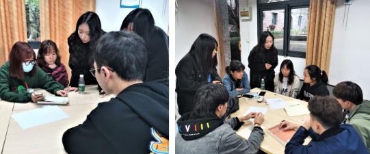 随后,同学们以小组为单位,根据汪老师所讲内容,对设计作业进行讨论和修改,四位老师也走进同学们中间,与大家一起交流,进行一对一指导。在热烈的氛围中,同学们就自己的思考和想法与老师们进行探讨,不仅认识和思路逐渐深入和清晰,同时也体会到学科交融,思维碰撞的乐趣。