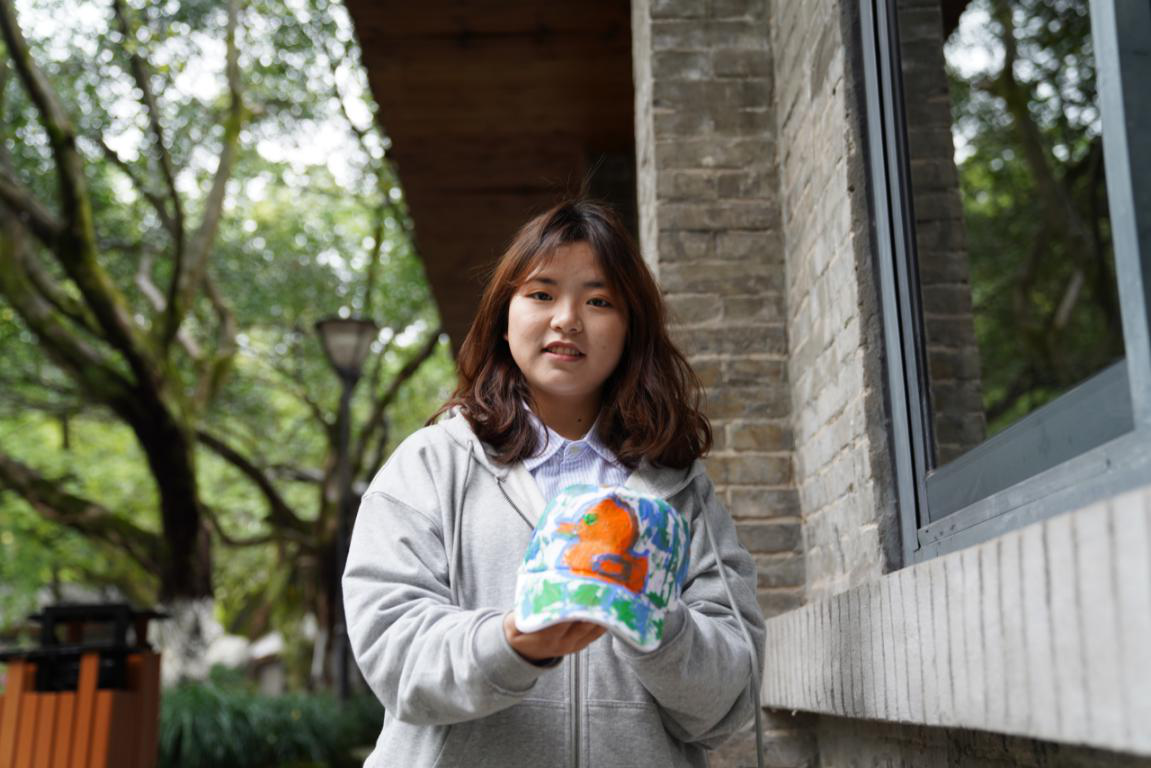 与此同时,服装设计组对废旧衣帽进行油彩涂鸦、裁剪等改装也进行的如火如荼,参与者们设计了“绿水青山”、“漫威联名”、“化学模型”、“平行时空”等丰富多彩的个性化作品。其中,一顶平凡的小黄鸭帽子显得独具一格,原创同学讲述其作品背后的故事:“我是青年志愿者协会的干事,每周都会到学府中央做‘四点半课堂’志愿活动,上次一个小弟弟让我帮他找丢失的小黄鸭帽子,但是没找到,所以我亲手画了一顶,打算这周送给他。”这份暖心故事是本次活动的意外收获。